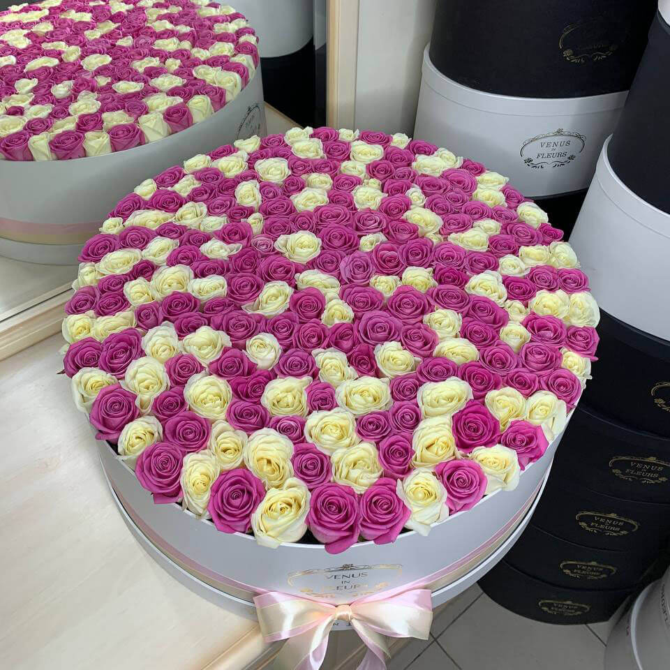 - белая коробка ручной работы, атласные ленты, флористическая губка