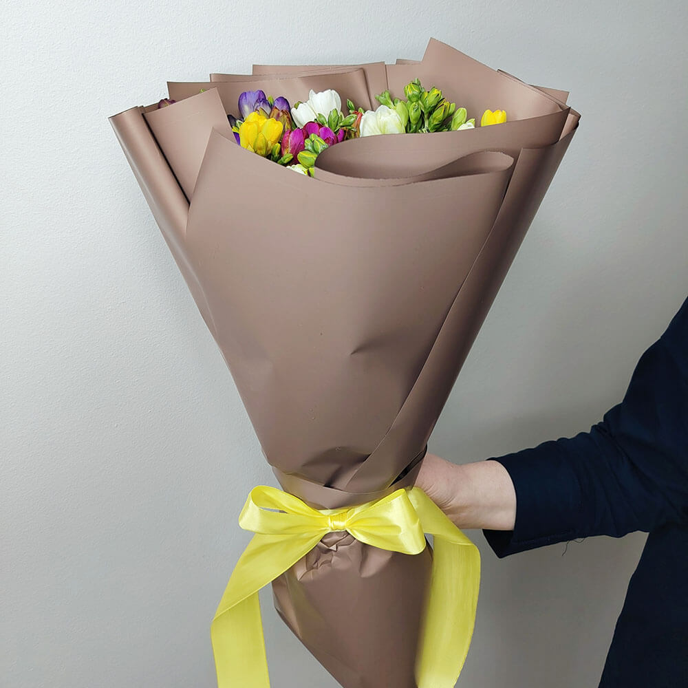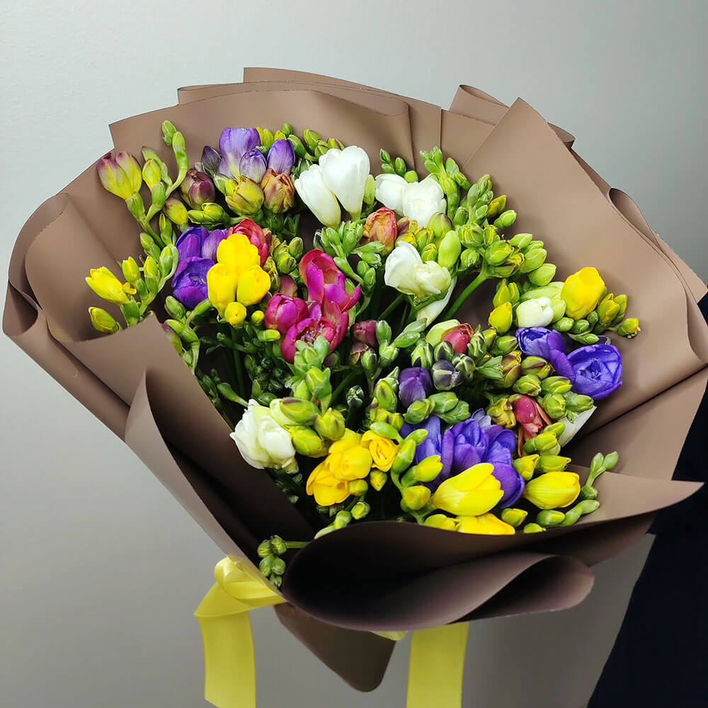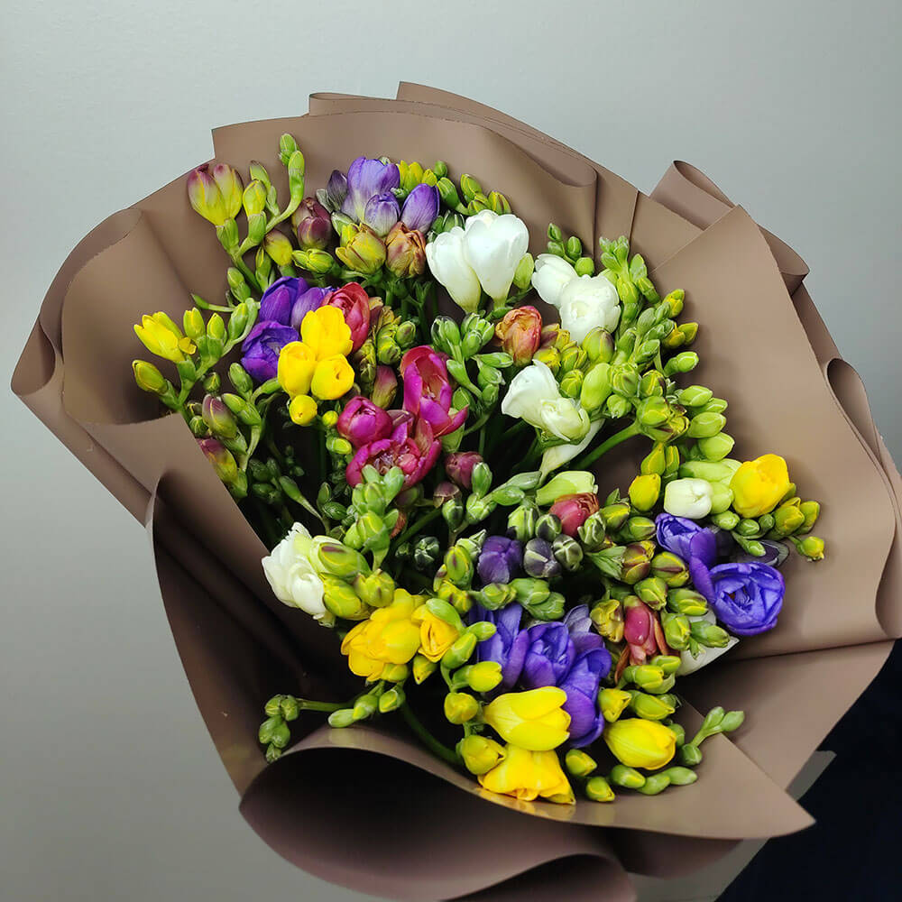 51 разноцветная фрезия в букете