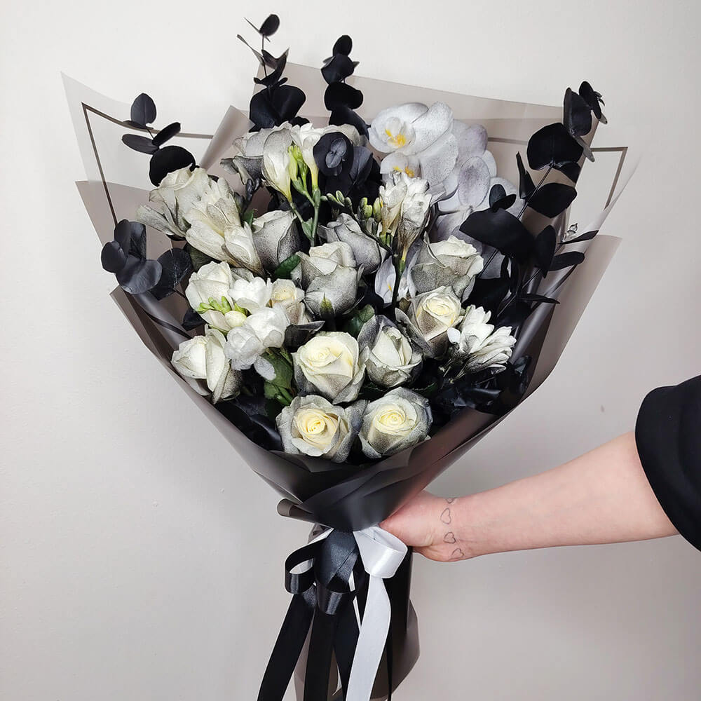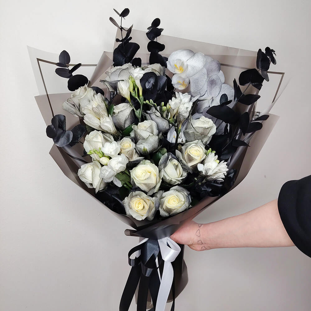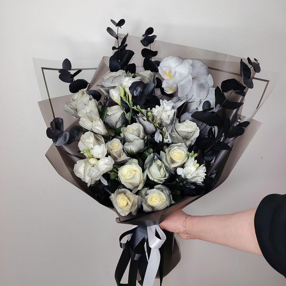 - 5 фрезий, 15 роз, 5 орхидей фаленопсис, эвкалипт