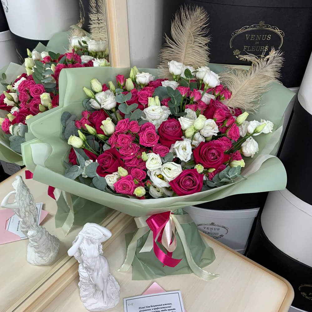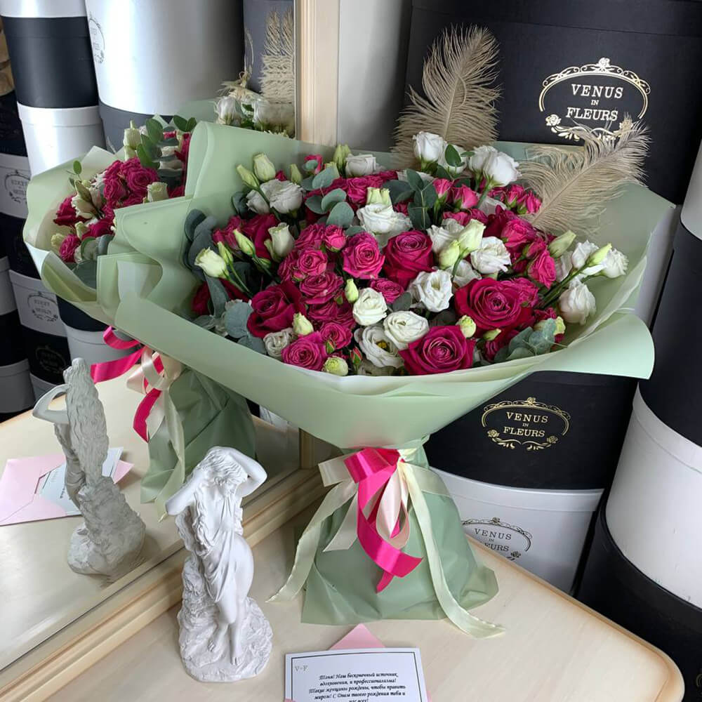 - 10 кустовых роз, 10 малиновых роз, 9 эустом, сухоцветы, эвкалипт