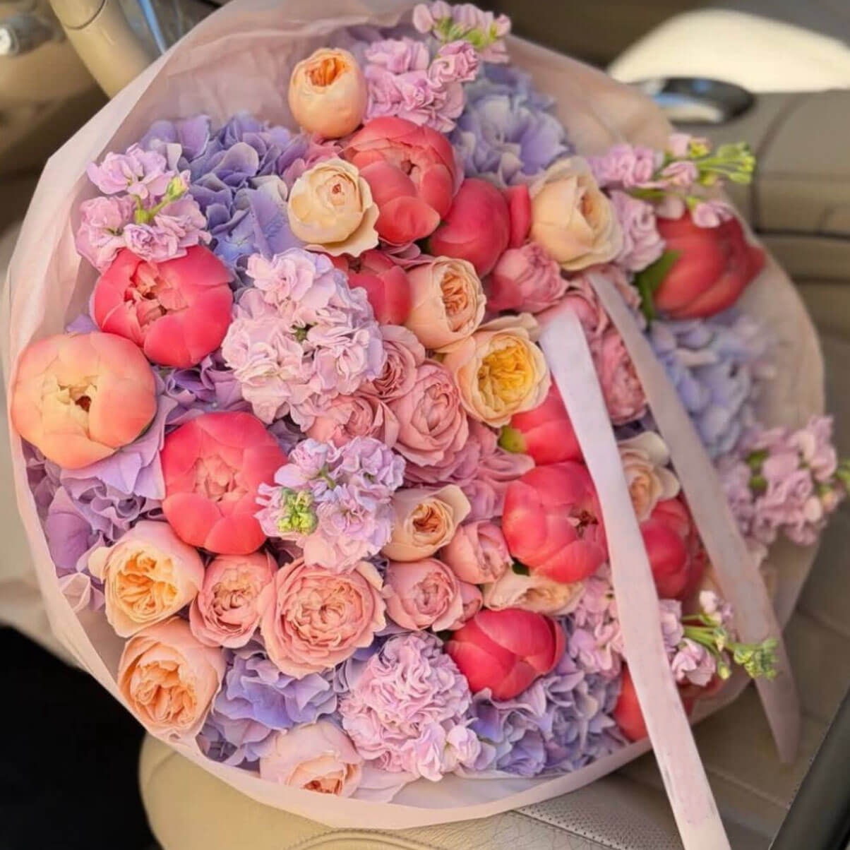 - 11 маттиол, 10 кустовых пионовидных роз,10 пионовидных роз, 15 коралловых пионов, 5 гортензий