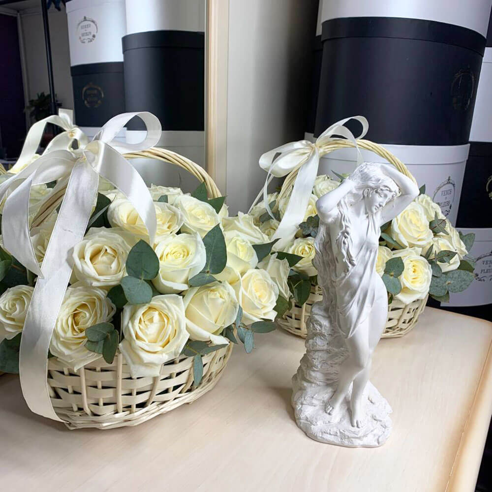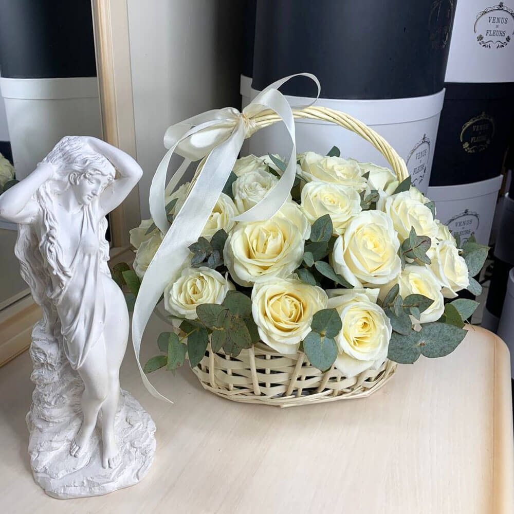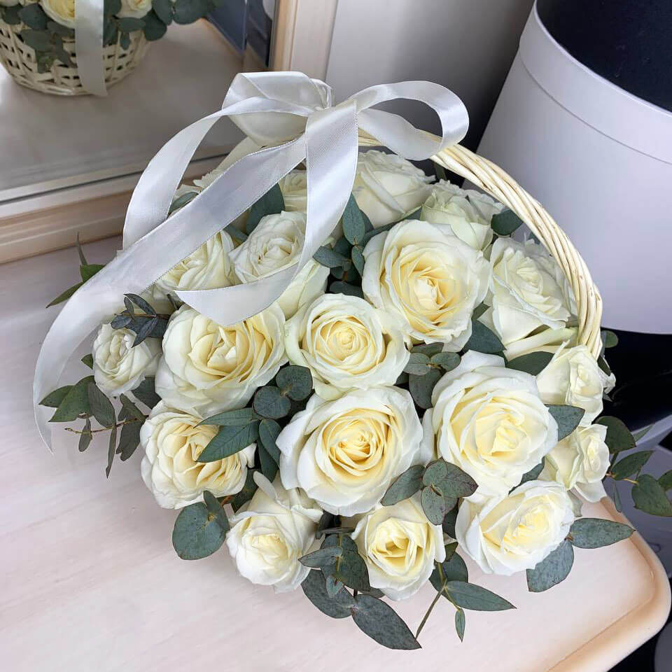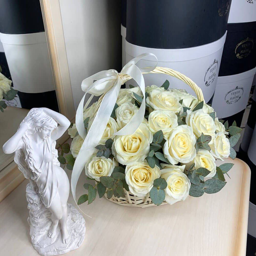 Белые розы в корзине - 31 шт.
