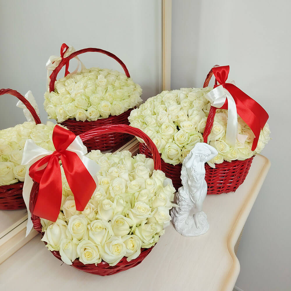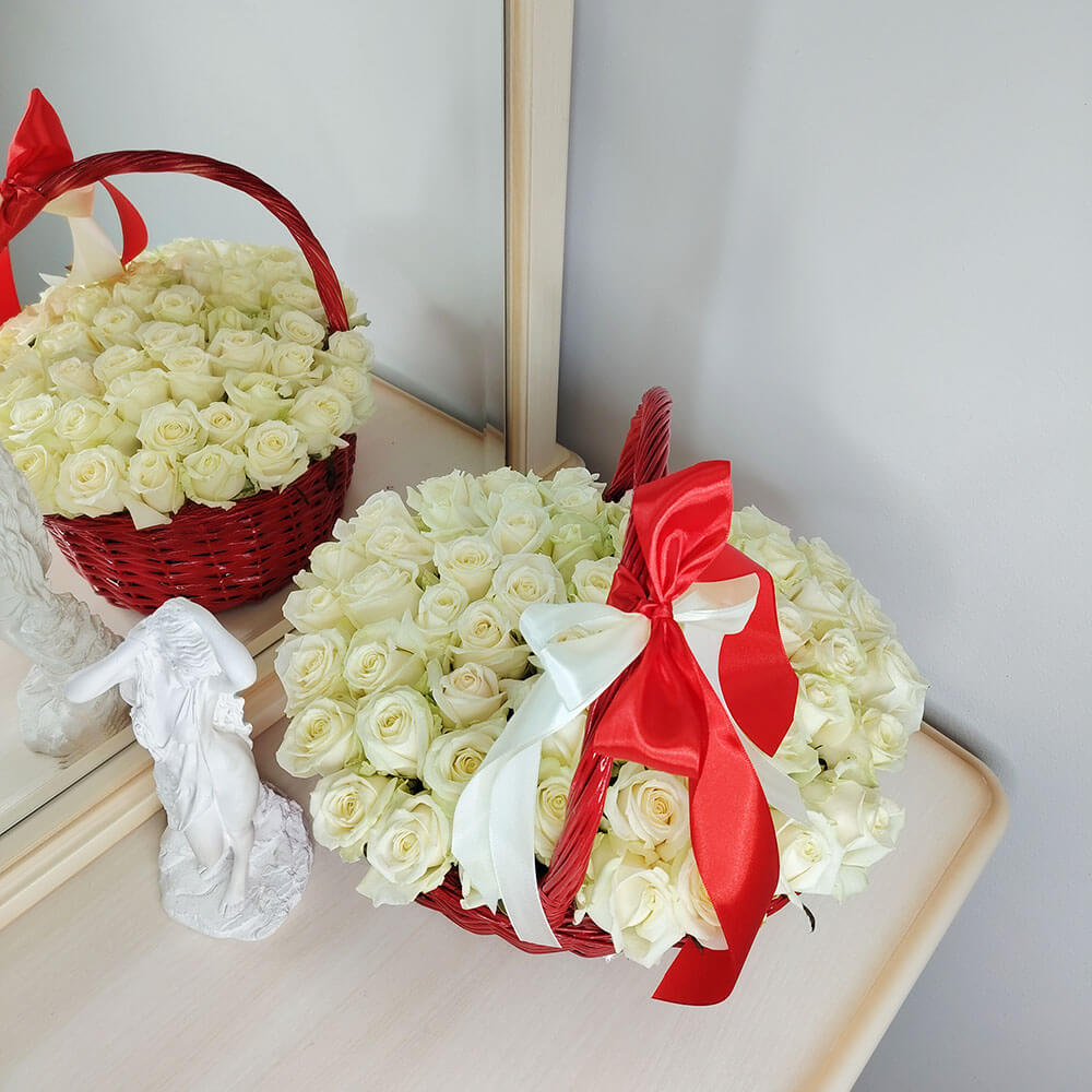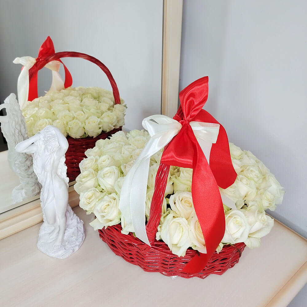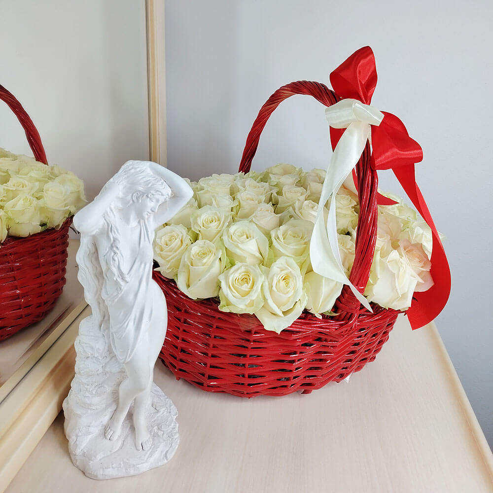 Белые розы в красной корзине от 51 шт.