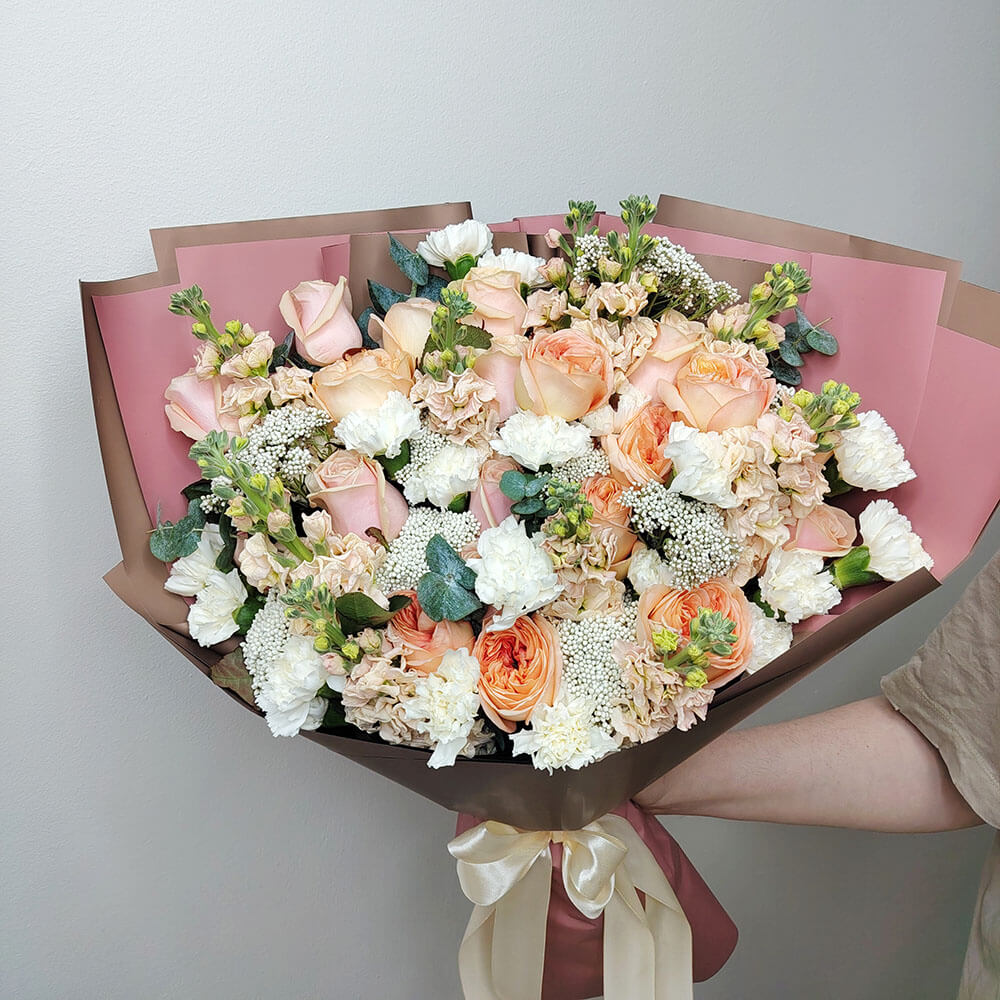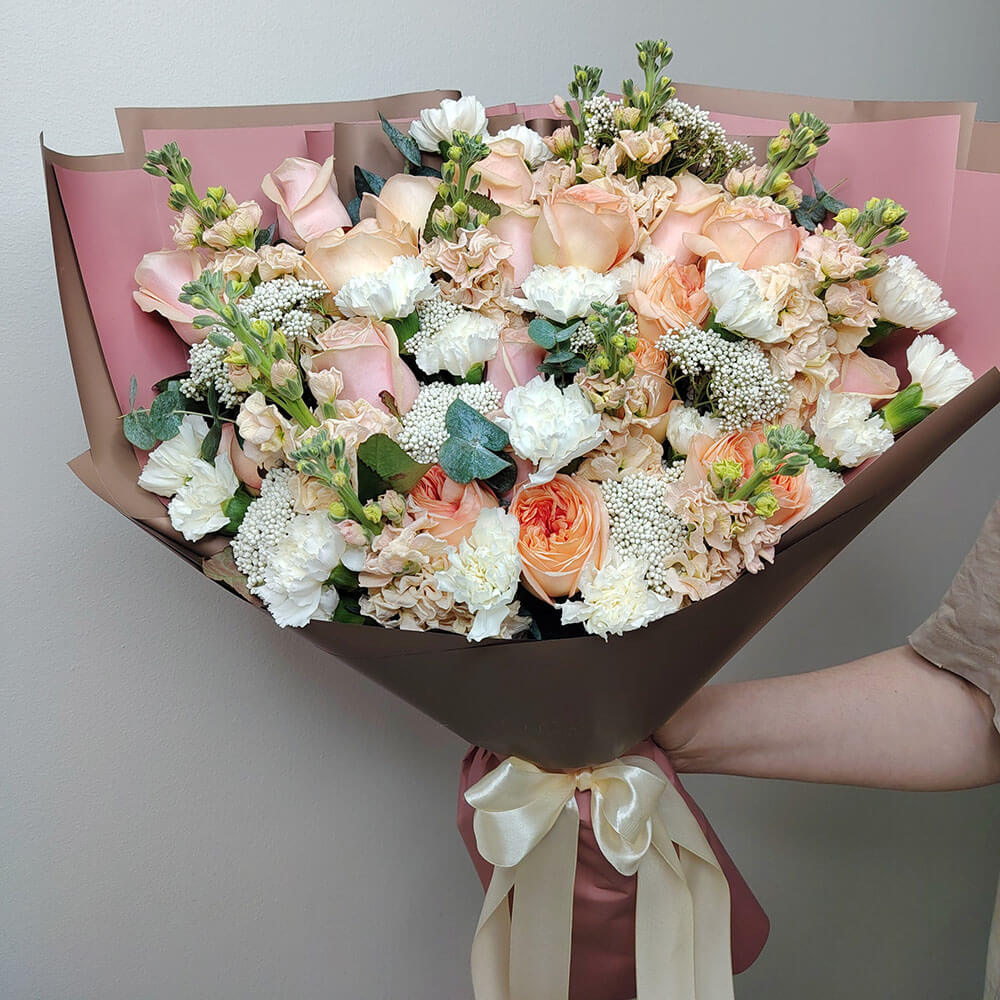 - 20 гвоздик, 10 маттиол, 11 роз, 10 пионовидных роз, озотамнус, эвкалипт