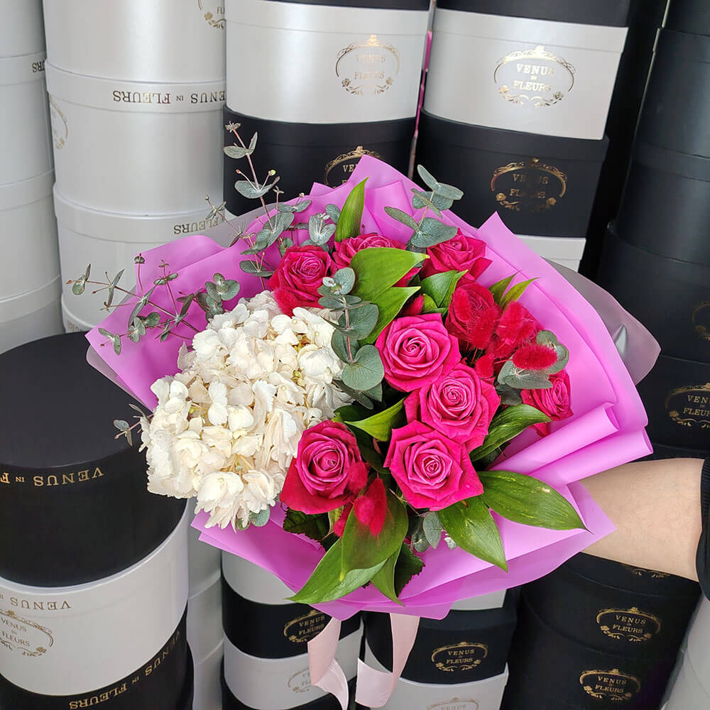 Букет малиновых роз с гортензией - 11 шт.