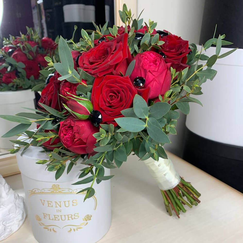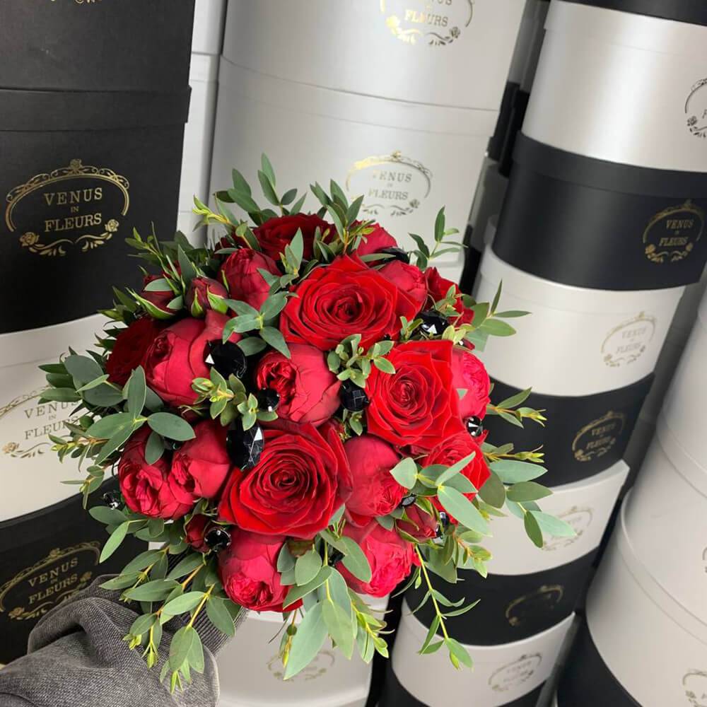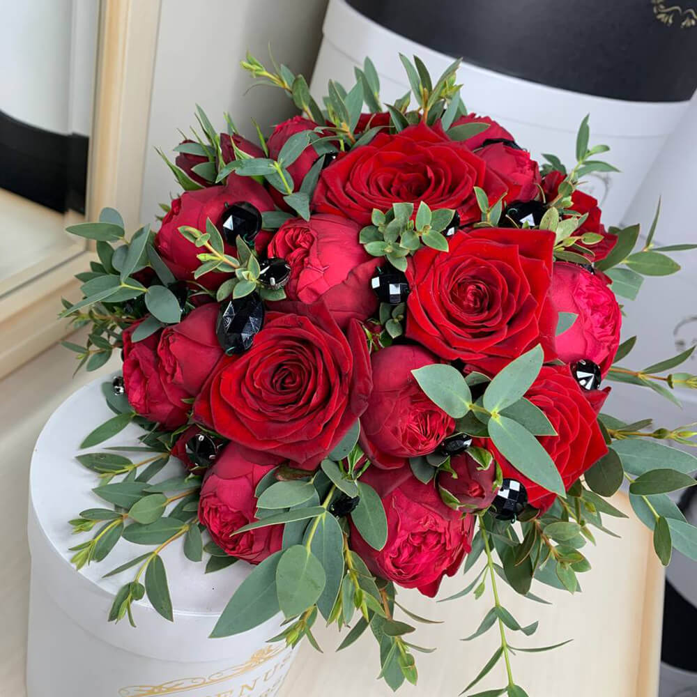 - 13 пионовидных роз, 8 роз, эвкалипт