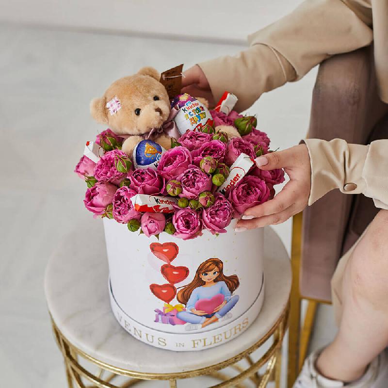 - кустовая пионовидная роза - 10 шт., киндер сюрприз - 2 шт., киндер шоколад - 4 шт., мишка - 1 шт.