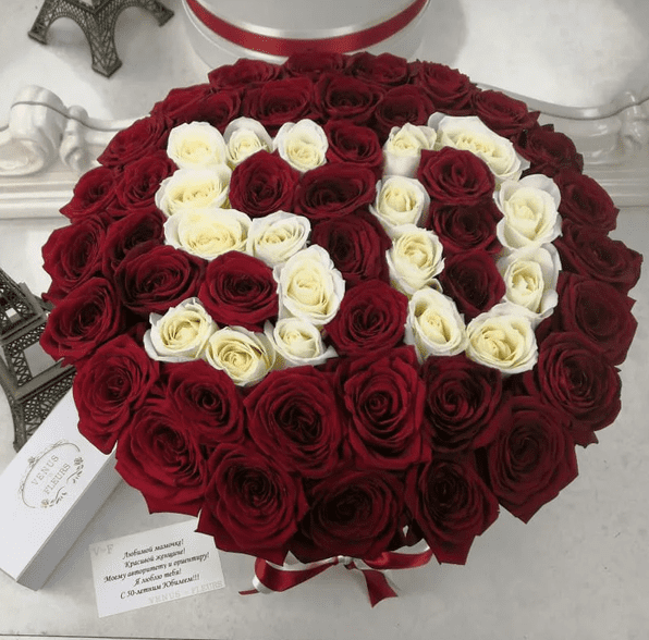 - корзины с надписью «50 лет» из контрастных бутонов, если вы хотите подчеркнуть красивую дату и при этом сохранить нечетное число цветов в букете.