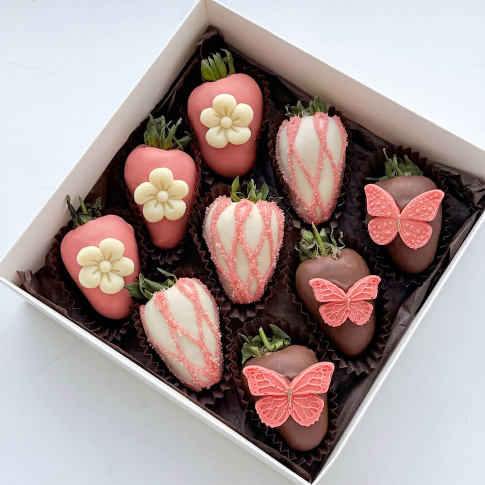 - Набор клубники в белом шоколаде, украшенной сублиматом, кокосовой стружкой и кандурином.