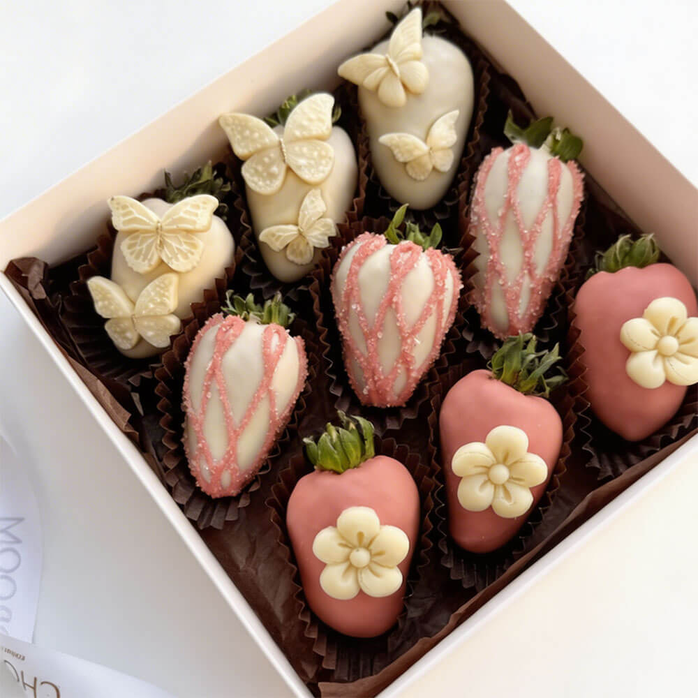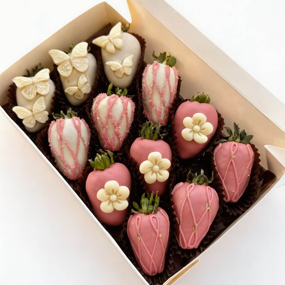 - Набор клубники в белом и молочном шоколаде, украшенной кокосовой стружкой, золотым сахаром и кондитерской посыпкой.
