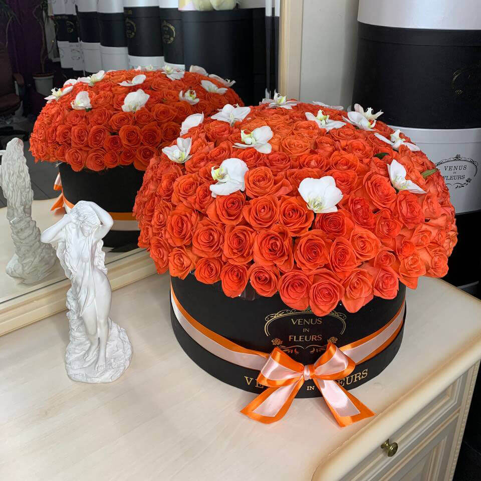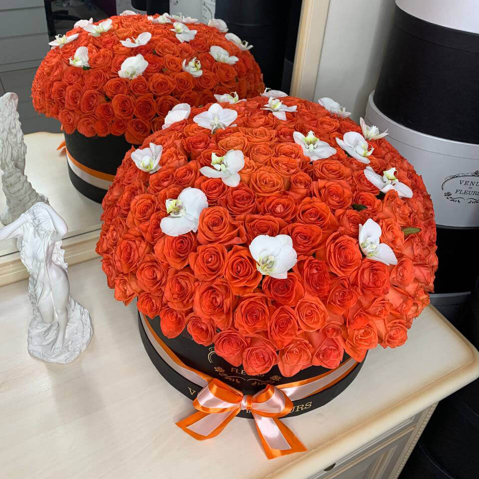 Коралловые розы с орхидеями в коробке от 101 шт.