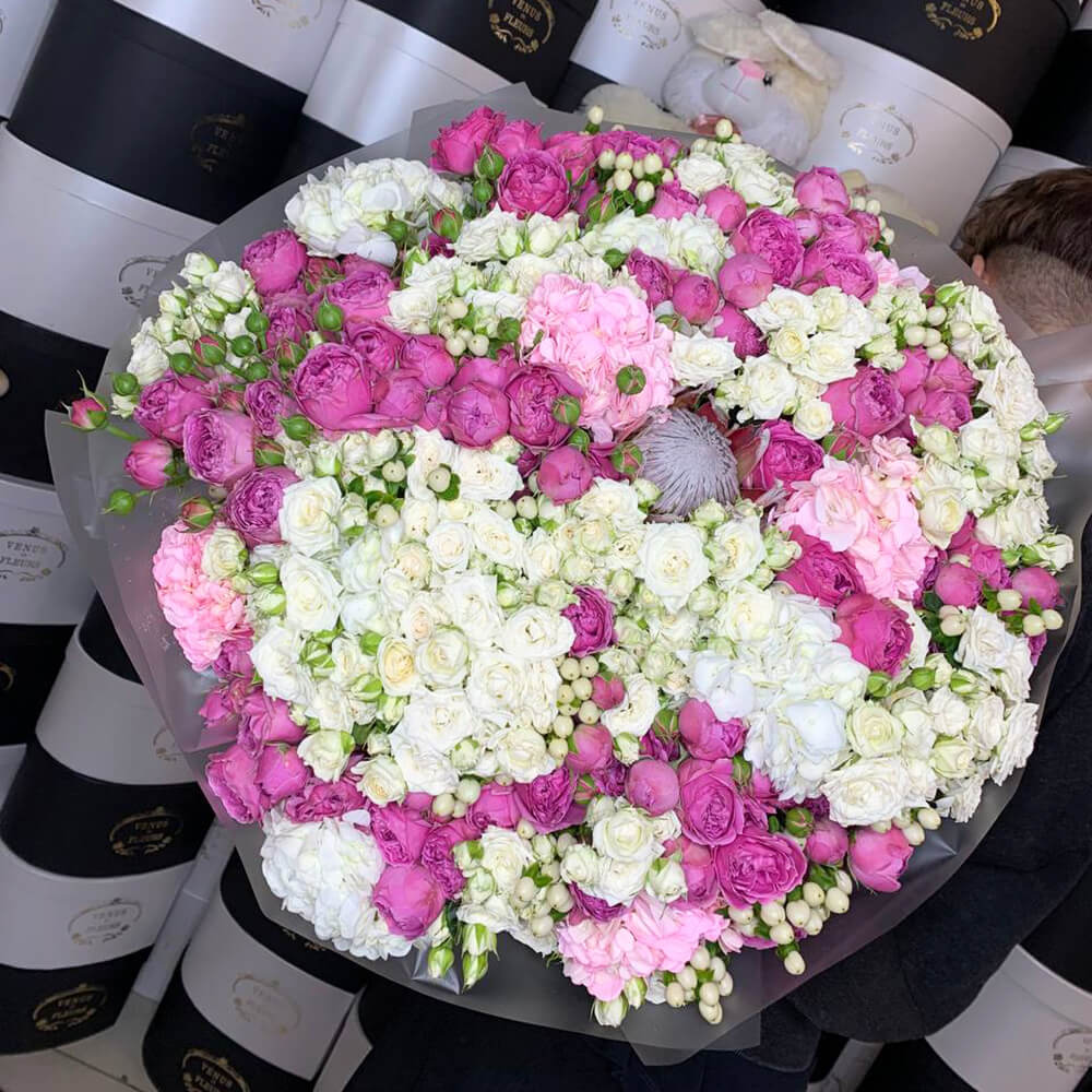 - 10 гортензий, 50 кустовых пионовидных роз, 20 гиперикум, 1 протея