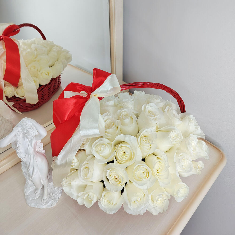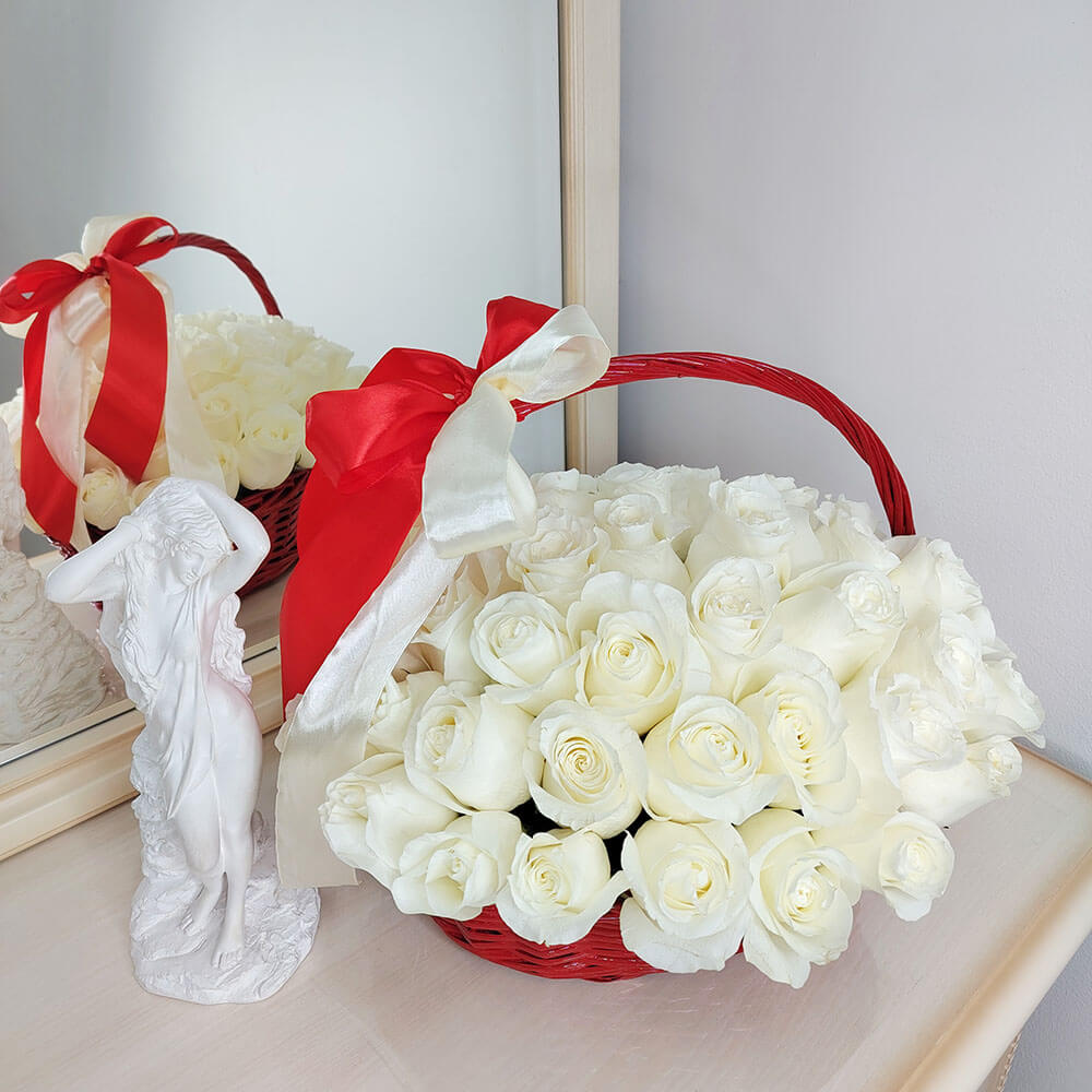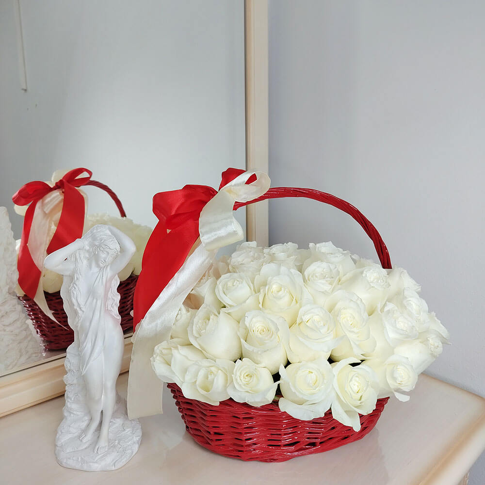 Красная корзина с эквадорскими розами от 25 шт.