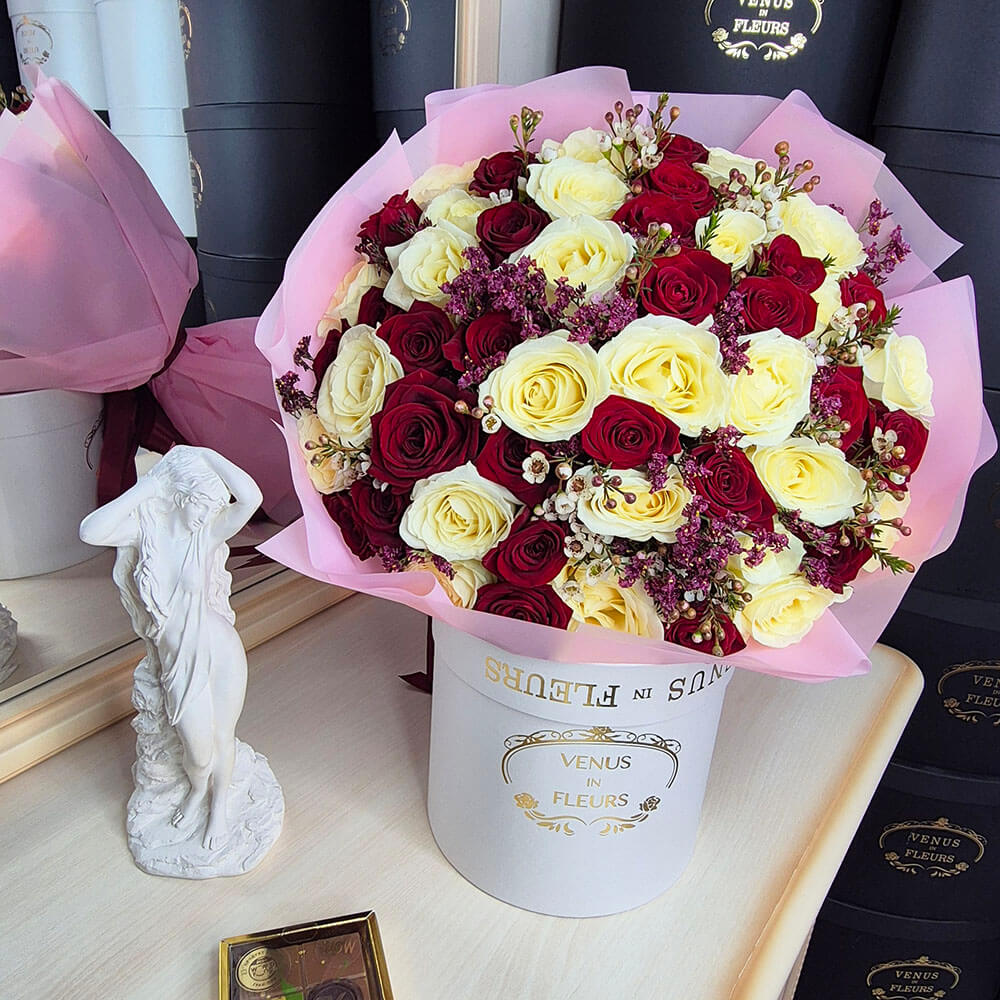 Красно-белые розы в букете от 29 шт.