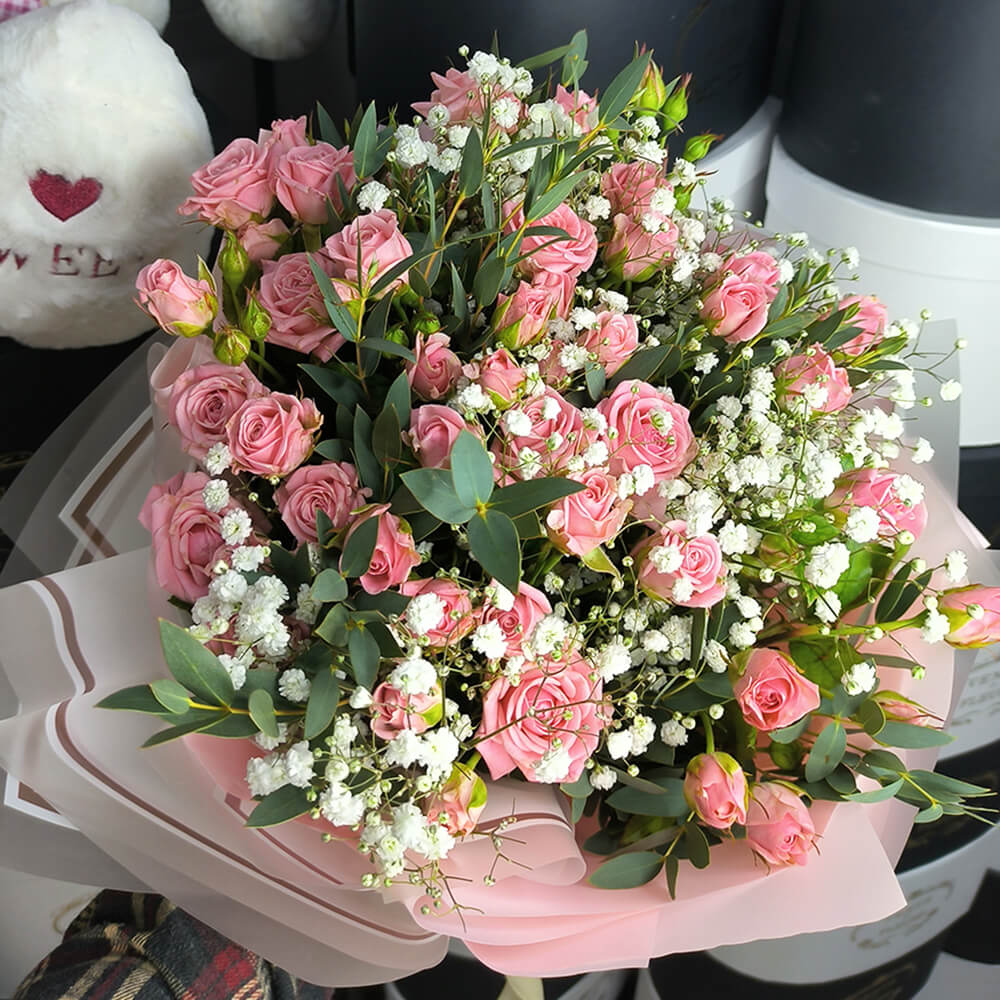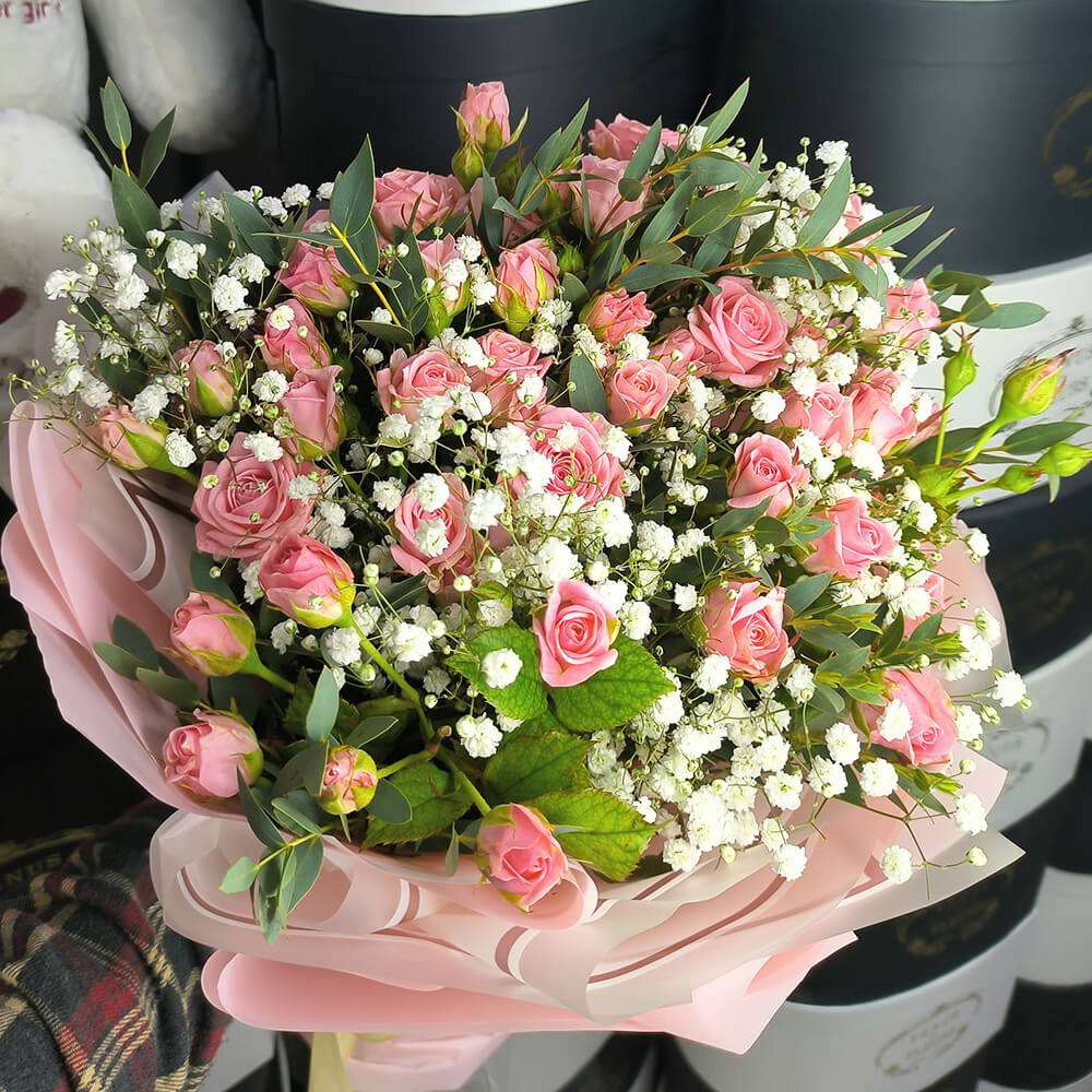 Кустовые розы с гипсофилой - 11 шт.