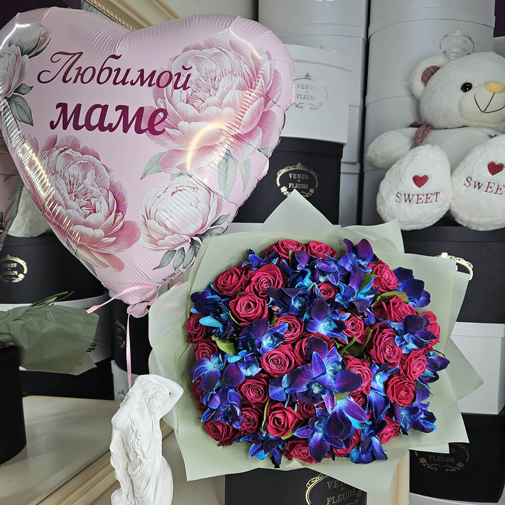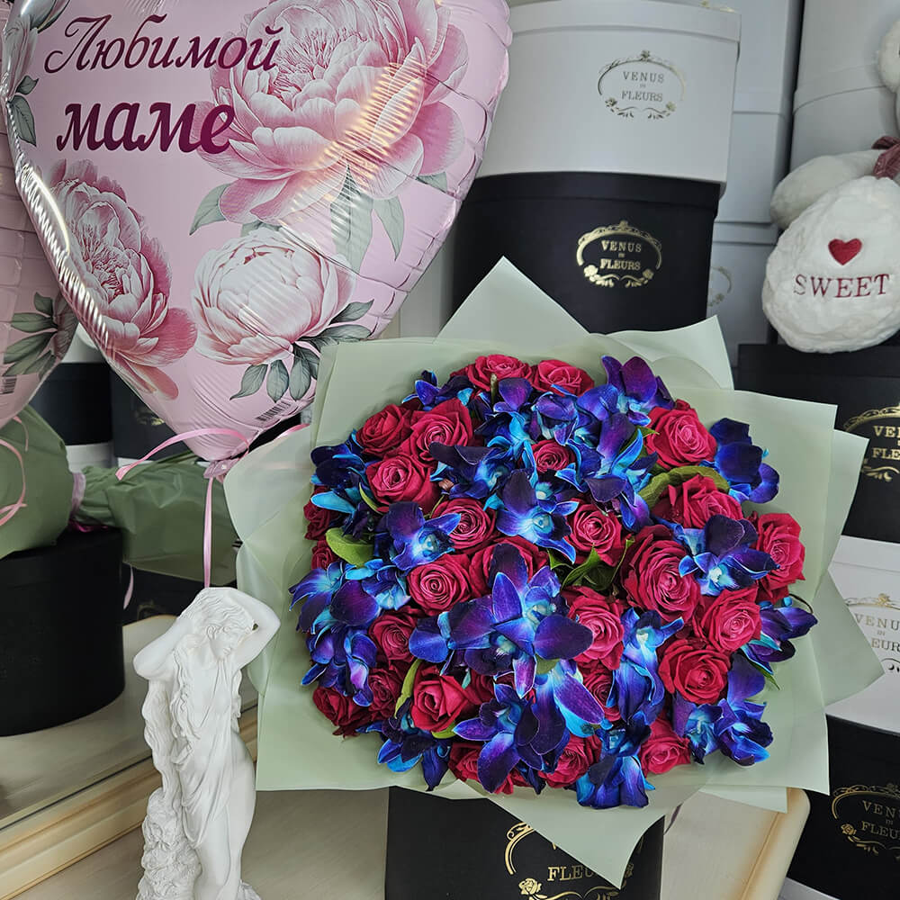 Малиновые розы с орхидеями в букете - 51 шт.