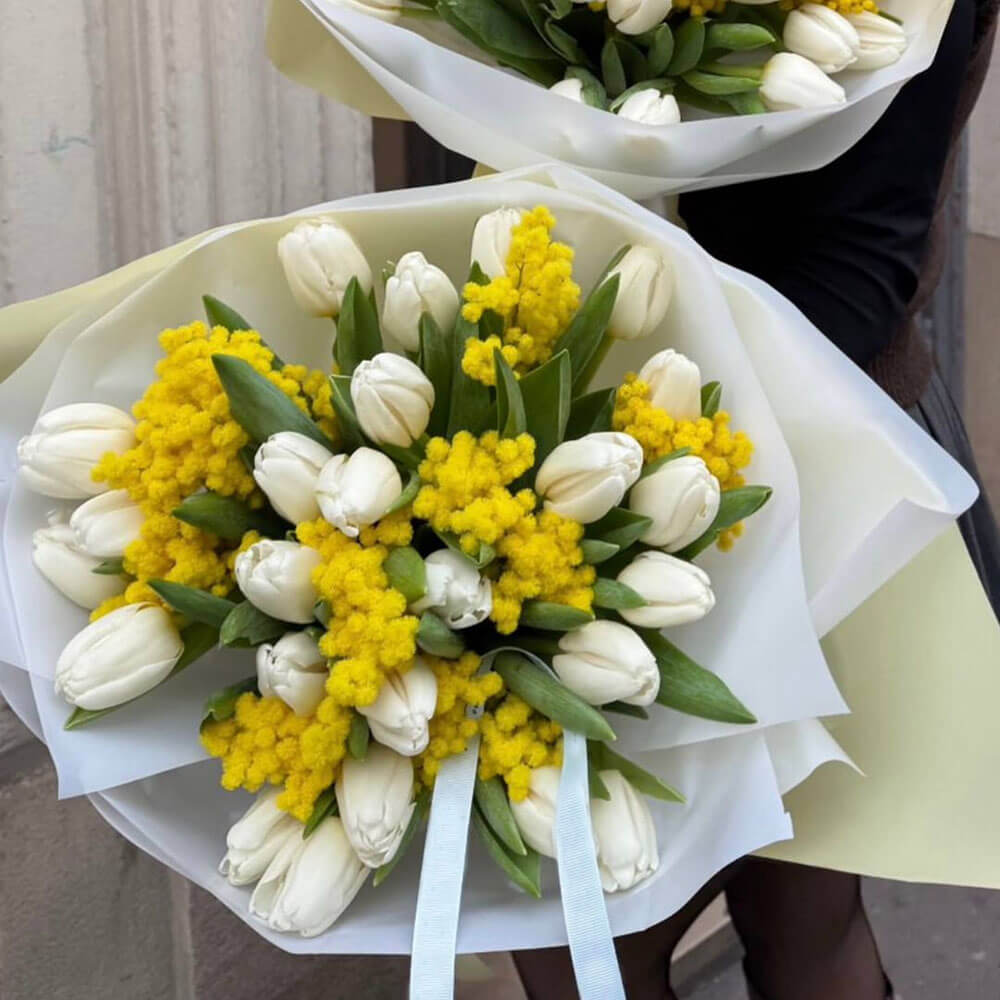 Мимозы с белыми тюльпанами - 35 шт.