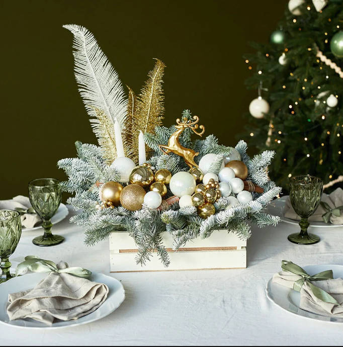 Эффектное сочетание голубой хвои с белыми и золотыми перьями, елочными игрушками, свечами создает торжественное настроение за праздничным столом. Внутри дизайнерского ящика оазис, благодаря которому ветви остаются свежими несколько недель.