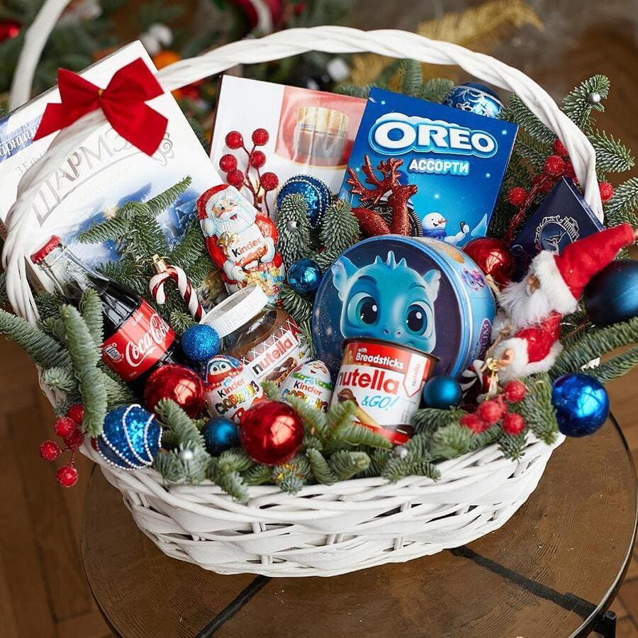 - нуттела с палочками- 1 шт., новогодние игрушки - 7 шт., киндер сюрприз - 2 шт., нобилис - 3 шт., киндер дед мороз - 1 шт., печенье орео - 1 шт., дед мороз - 1 шт., нуттела 180 гр - 1 шт., зефир шармель 150 гр. - 1 шт., вдохновение 100 гр. - 1 шт., набор Мерси - 1 шт., печенье с драконом - 1 шт., Coca-Cola 0,33 - 1 шт. (возможна замена)