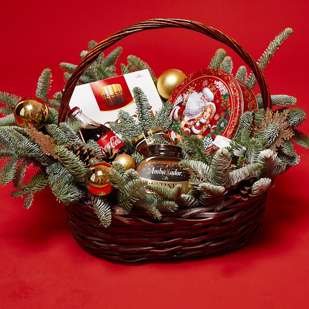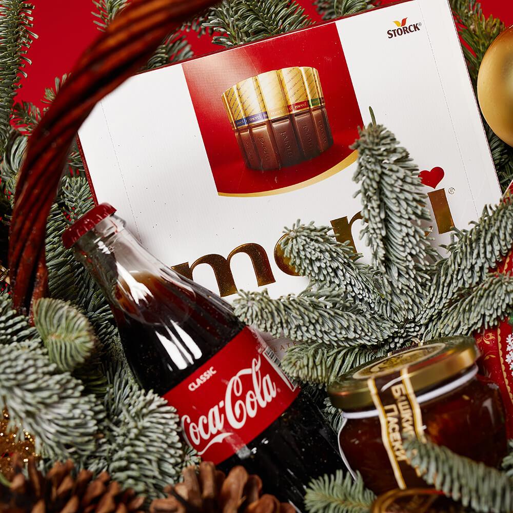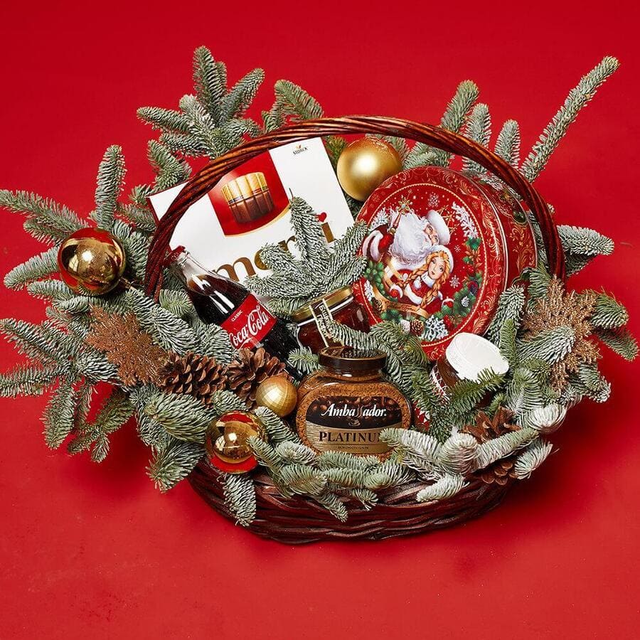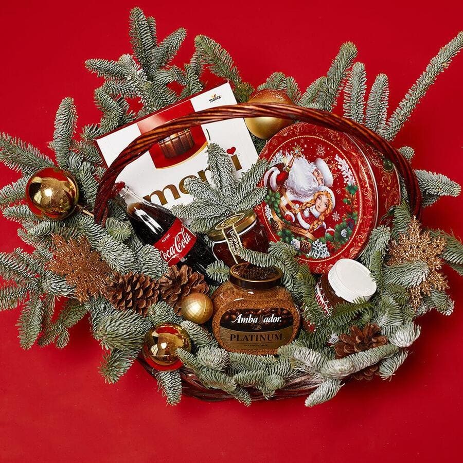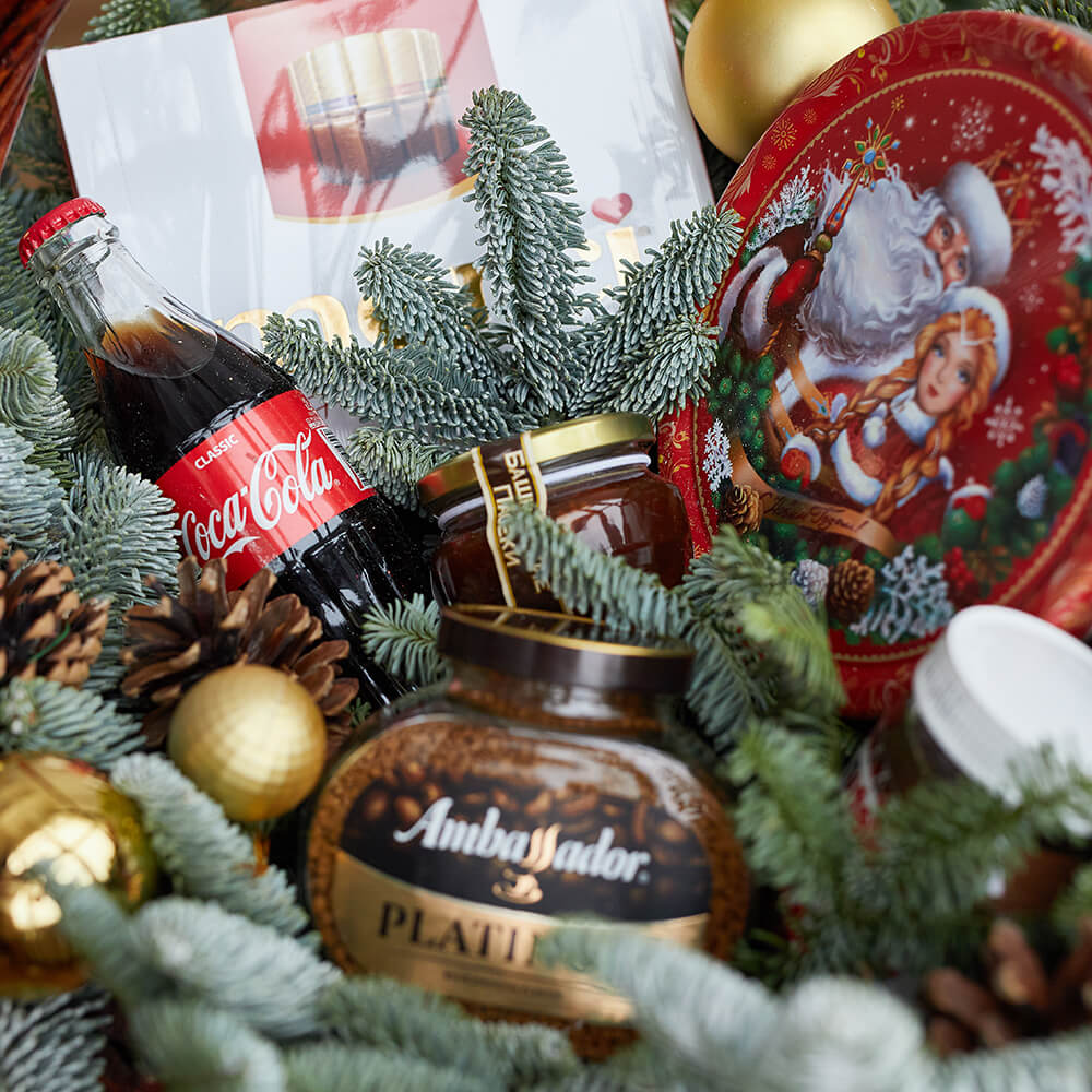 - новогодние игрушки - 4 шт., шишки - 3 шт., нобилис - 3 шт., мед - 1 шт., кофе амбассадор - 1 шт., ассорти мерси - 1 шт., новогоднее печенье - 1 шт., coca-cola 0,33 - 1 шт. (возможна замена)