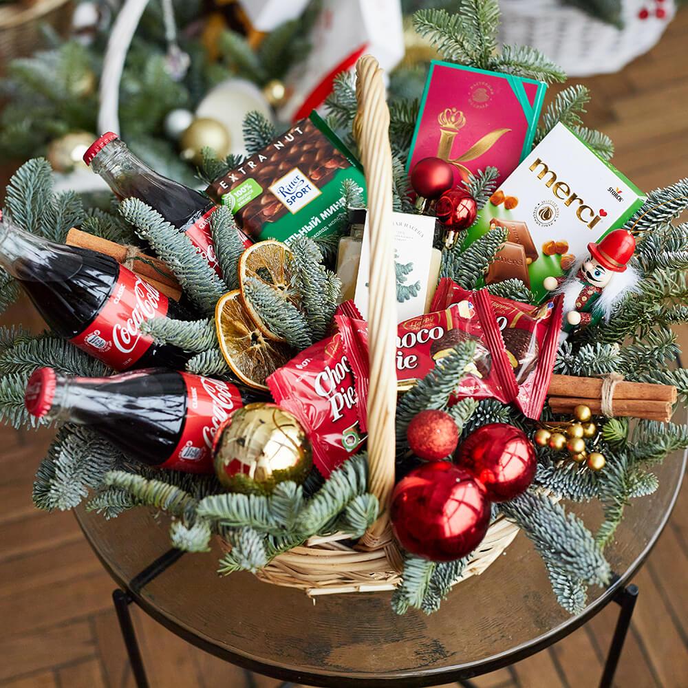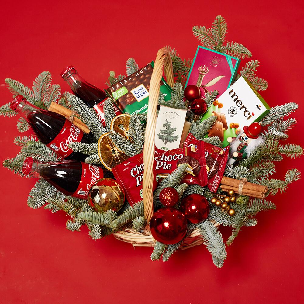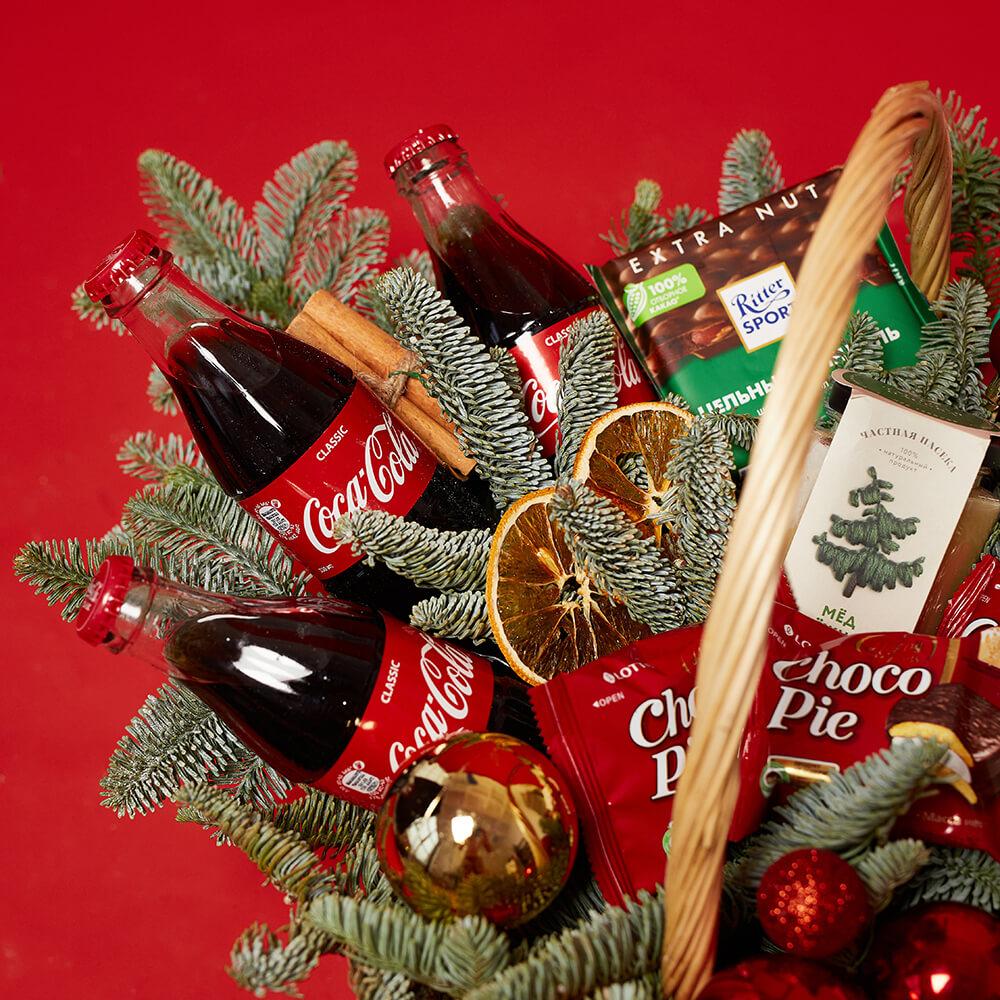 - новогодние игрушки - 5 шт., апельсиновые дольки - 2 шт. шишки - 1 шт., нобилис., щелкунчик - 1 шт., мед - 1 шт., печенье чокопай - 1 шт., мерси плитка - 1 шт., ritter sport - 1 шт., коркунов плитка - 1 шт., coca-cola 0,33 - 1 шт. (возможна замена)