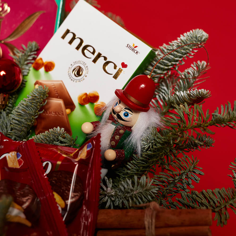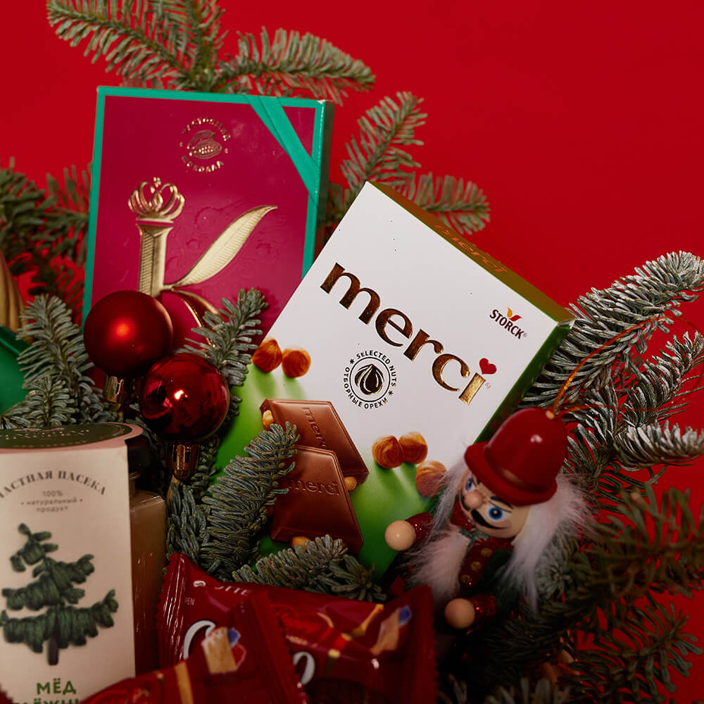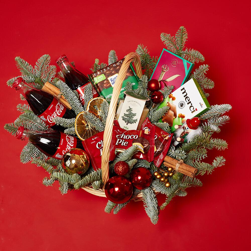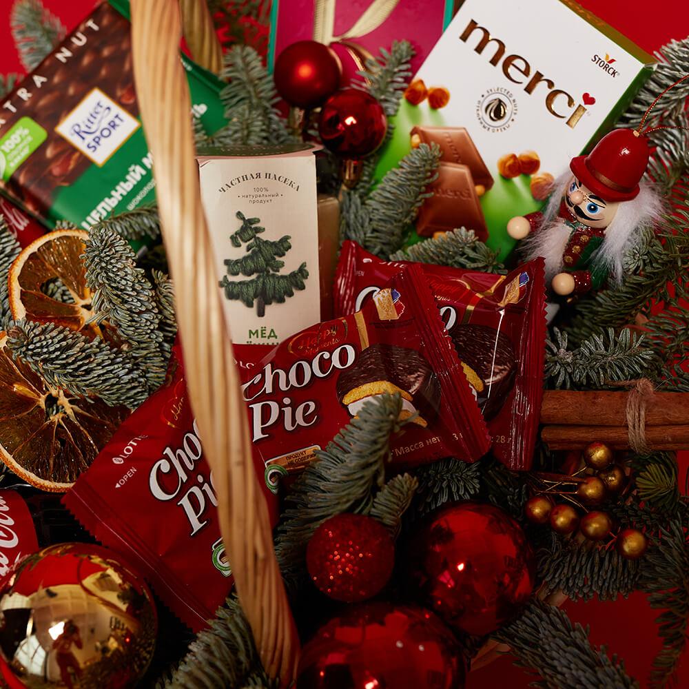 - новогодние игрушки - 5 шт., апельсиновые дольки - 2 шт. шишки - 1 шт., нобилис., щелкунчик - 1 шт., мед - 1 шт., печенье чокопай - 1 шт., мерси плитка - 1 шт., ritter sport - 1 шт., коркунов плитка - 1 шт., coca-cola 0,33 - 1 шт. (возможна замена)