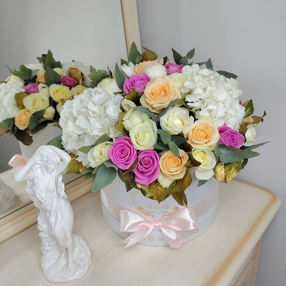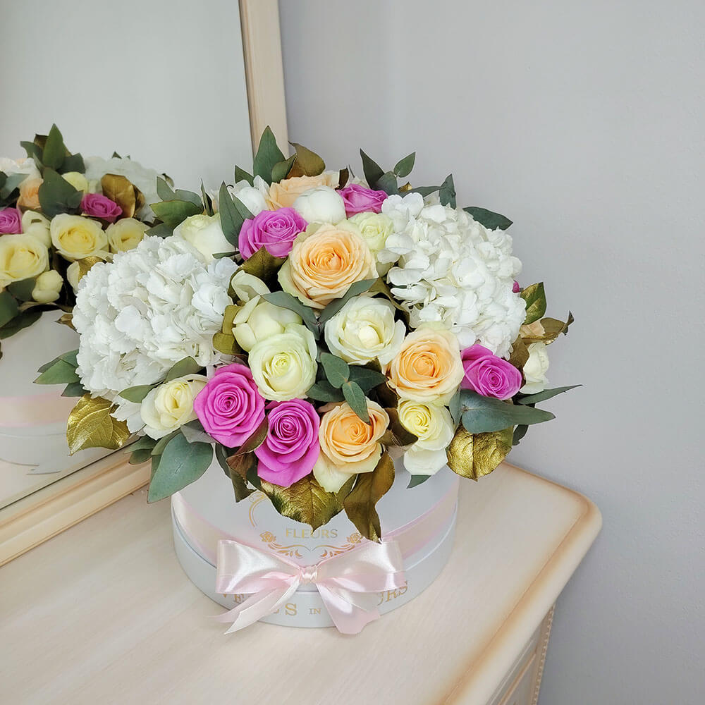 - 10 пионов, 38 роз, 3 гортензии, эвкалипт, золотые листья