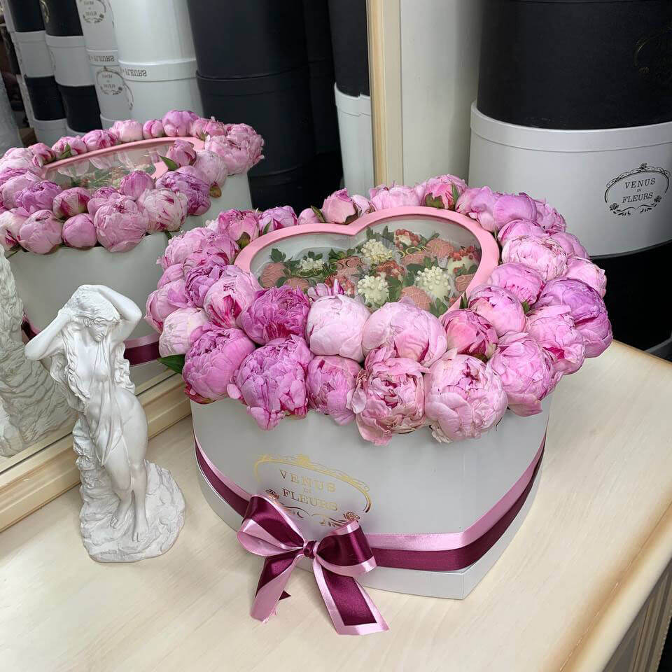 - 39 пионов, 25-27 клубники в шоколаде в сердце