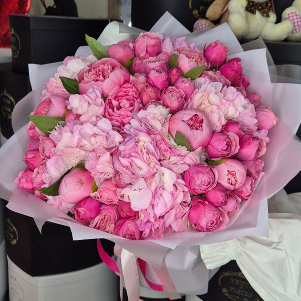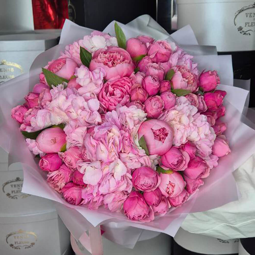 - 10 пионов, 20 кустовых пионовидных роз, гортензии - 5 шт.