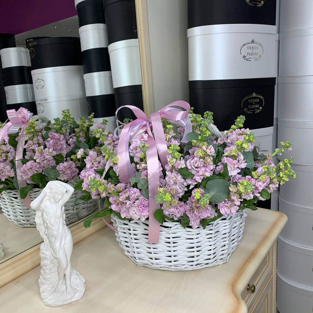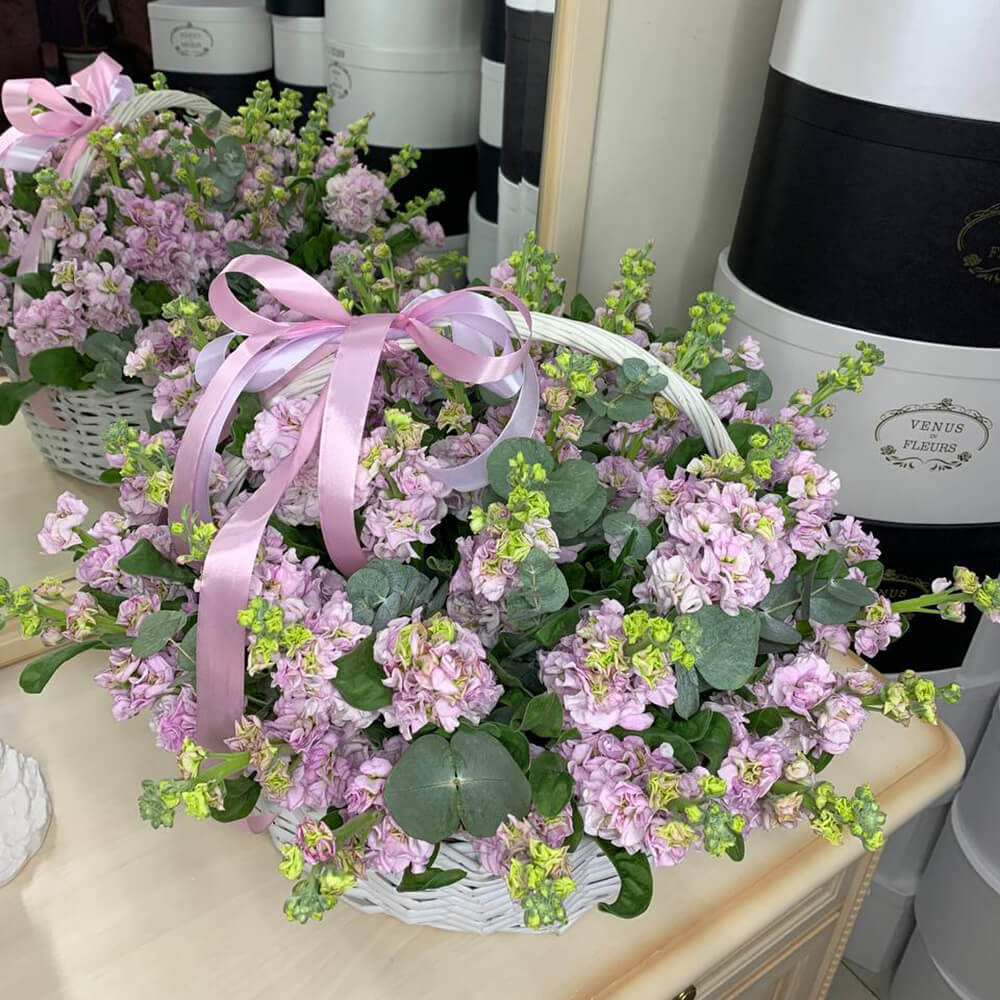 Розовые маттиолы в корзине - 51 шт.