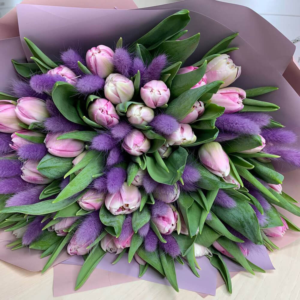 Розовые тюльпаны с лагурусом - 101 шт.