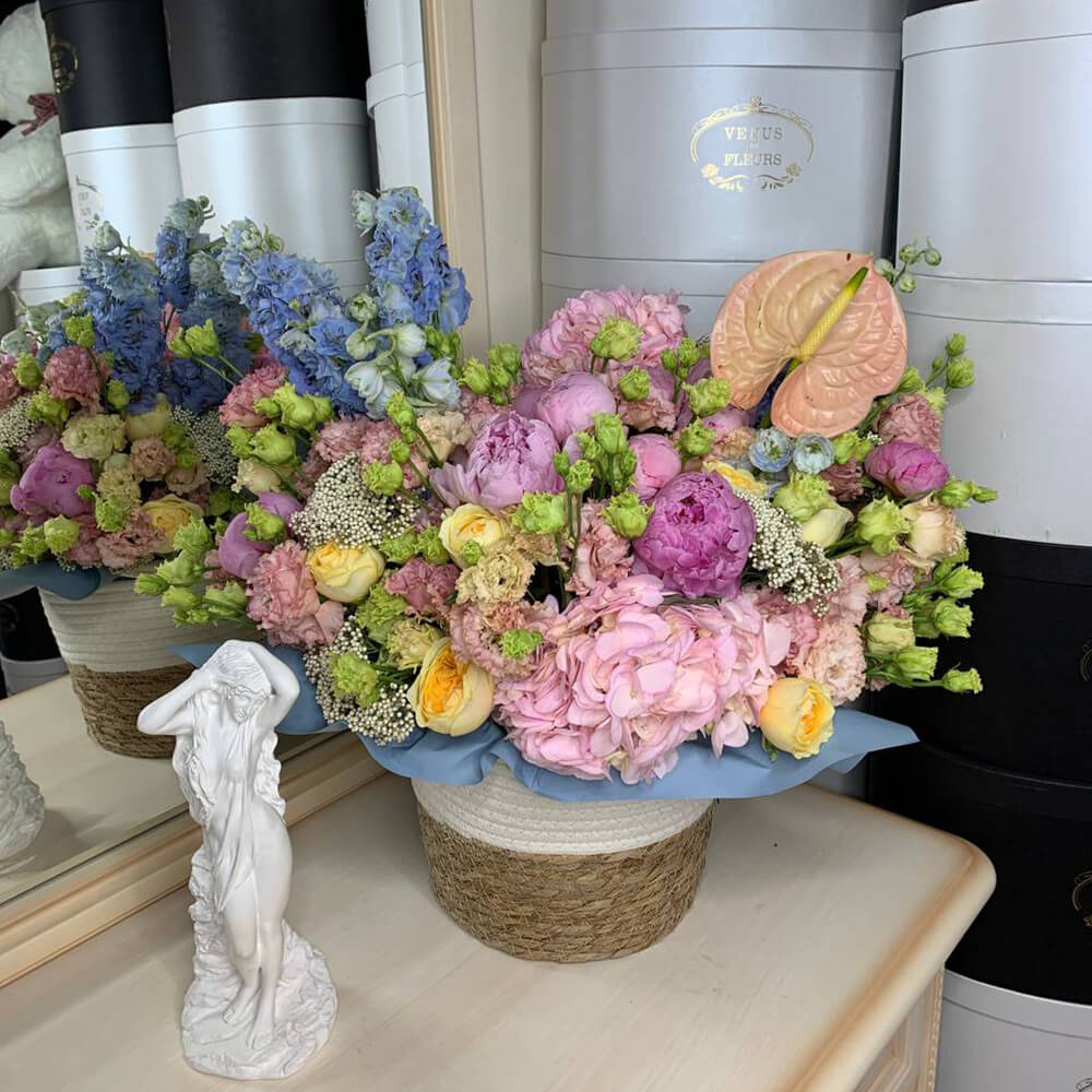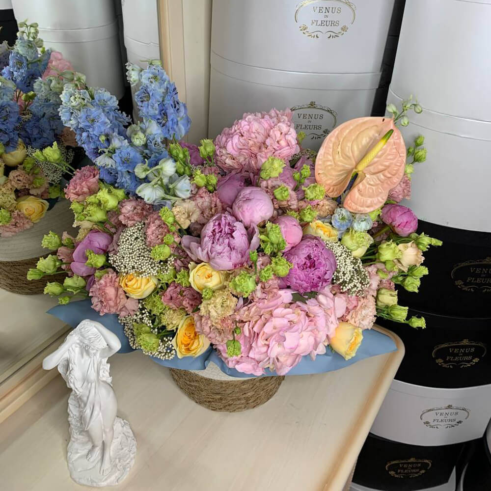 - 10 дельфиниумов, 10 пионов, 10 роз, 20 эустом, озотамнус , антуриум, 3 гортензии