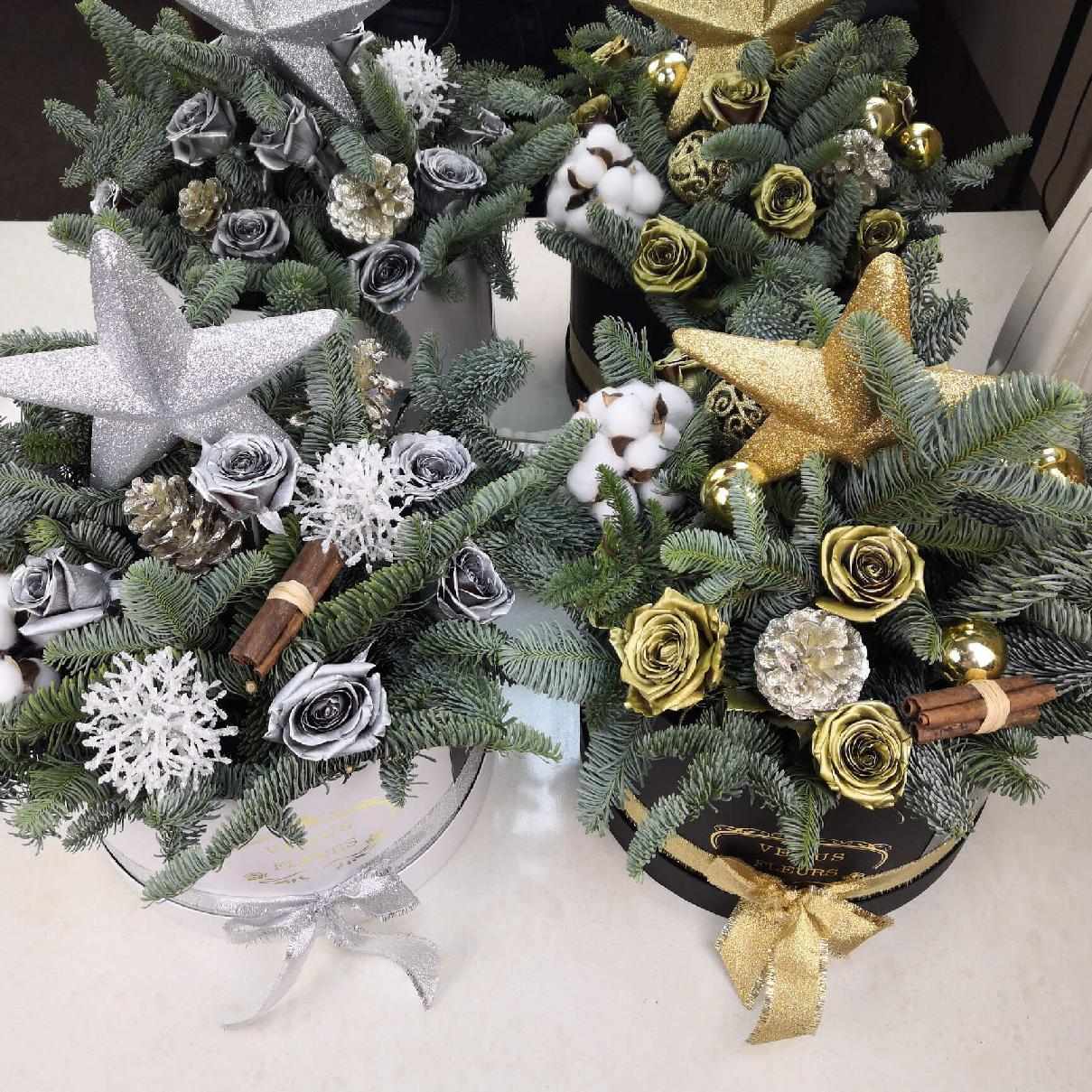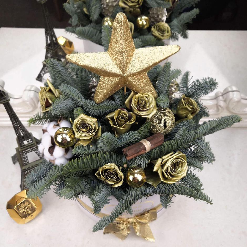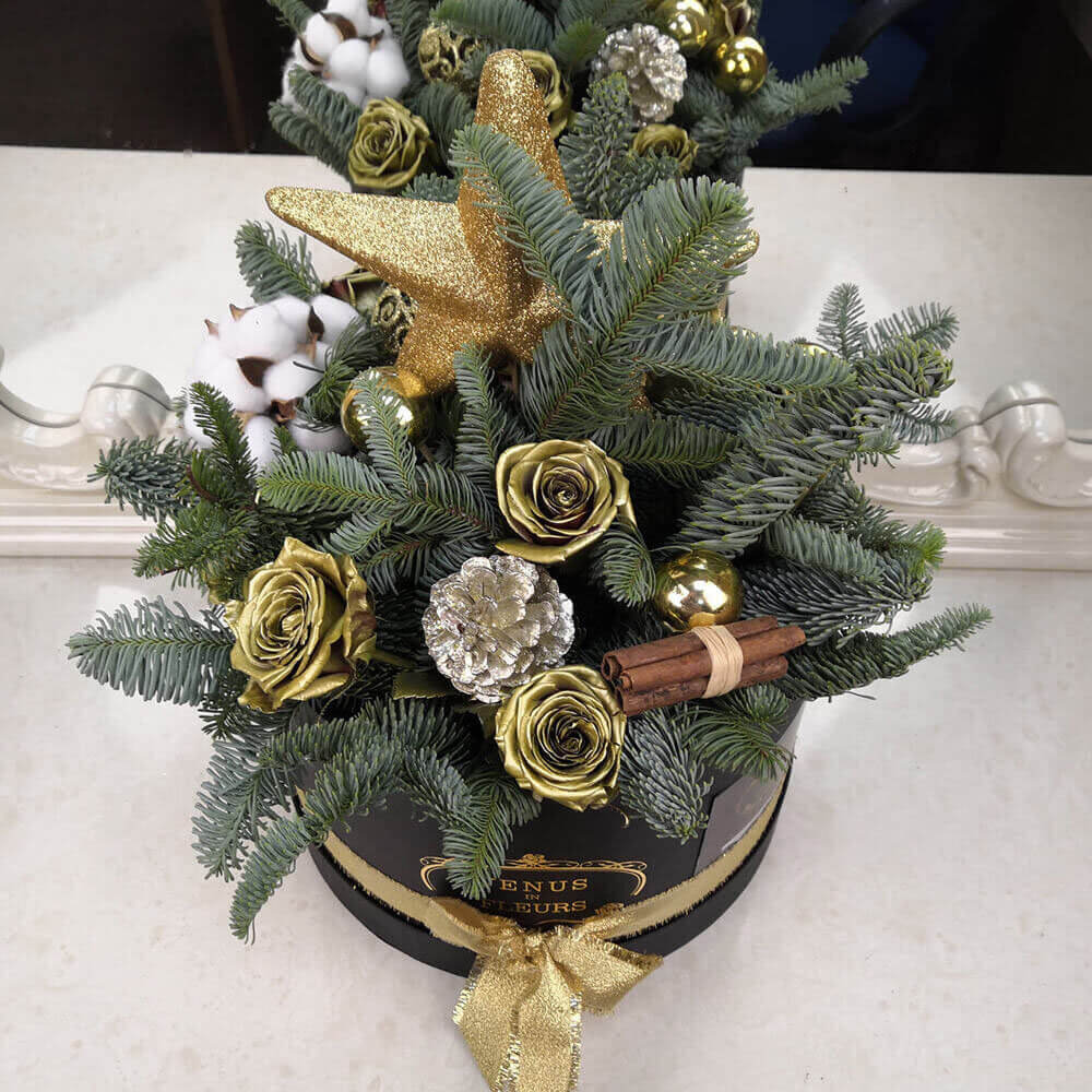 - 5 золотых роз, шишки - 3 шт, 3 игрушки, хлопок - 4 шт., украшения - 5 шт., нобилис