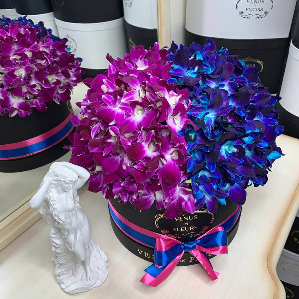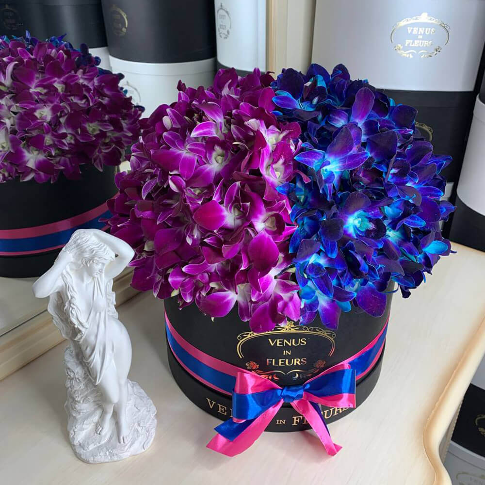 Сине-розовые орхидеи в коробке от 51 шт.