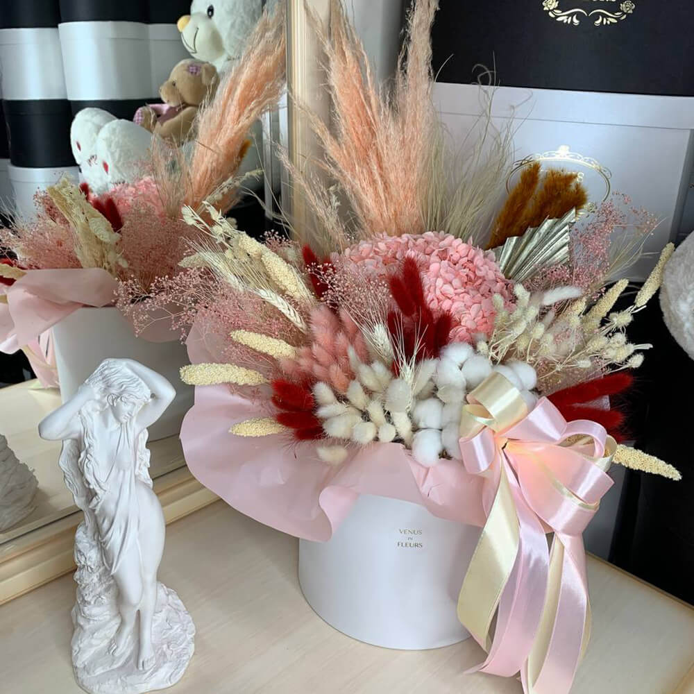 - декоративная гортензия - 1 шт., золотой лист - 1 шт., хлопок - 3 шт., ковыль - 10 шт., лагурус - 20 шт., пшеница - 10 шт., нигель - 10 шт.