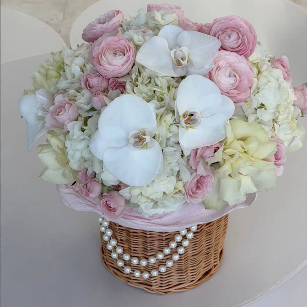 - 25 французских роз, 10 ранункулюсов, 5 орхидей, 5 гортензий, 10 пионовидных роз